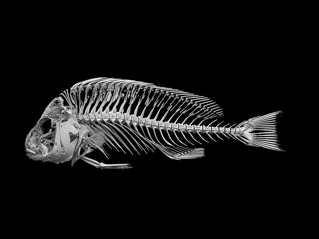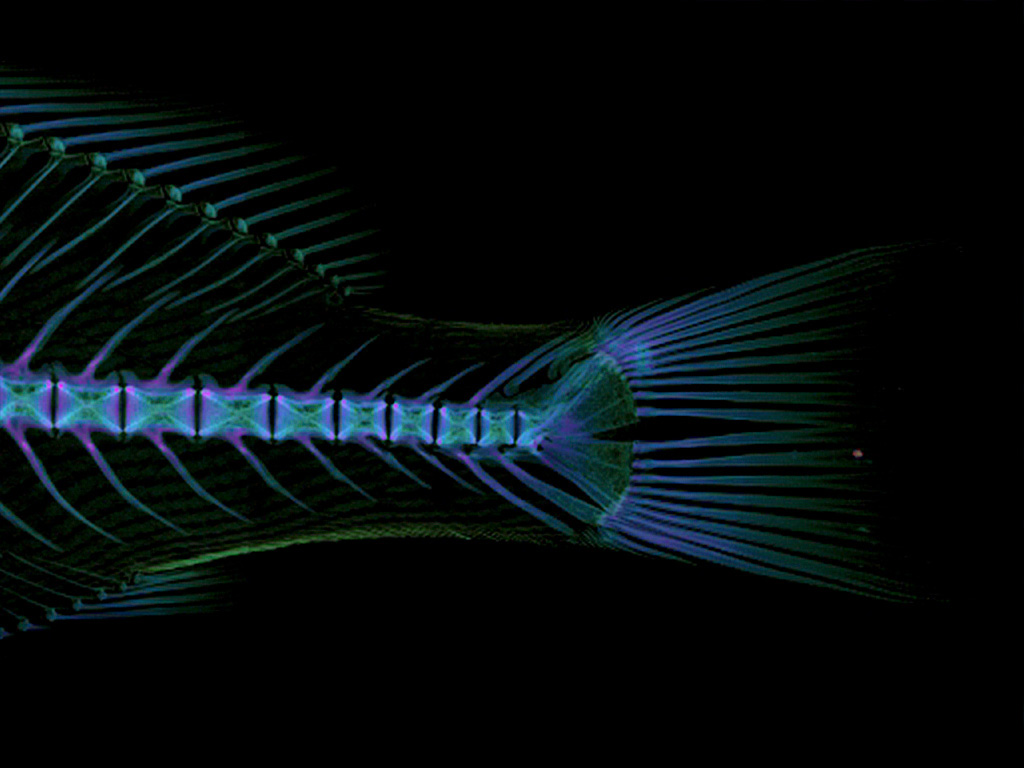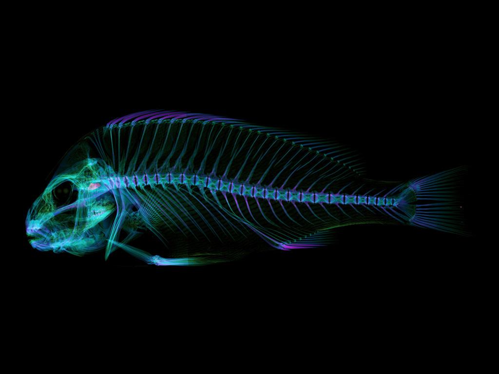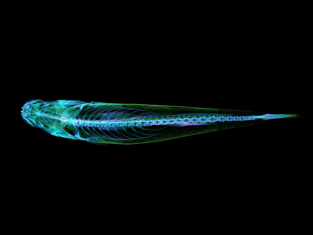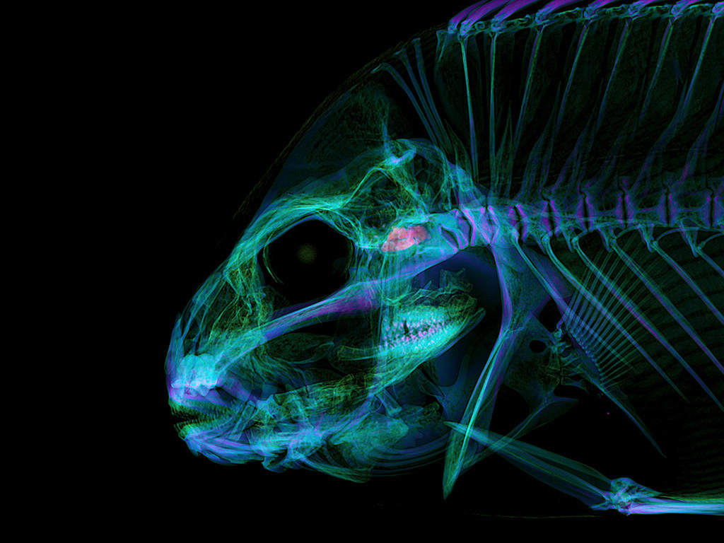 The CT scan reveals a widely developed jaw skeleton in the head and a solid row of teeth within it, specialized for crushing hard-shelled shrimp and crabs. Along the body sides, the skeleton and muscles are densely arranged, showing a structure designed for explosive force.