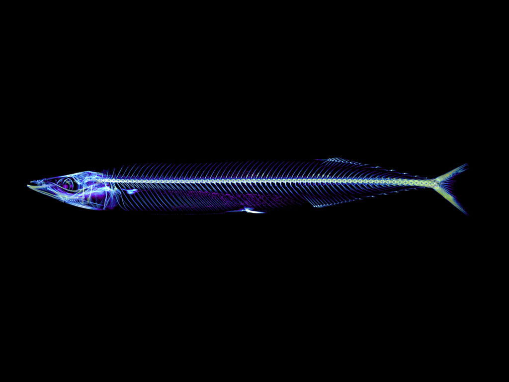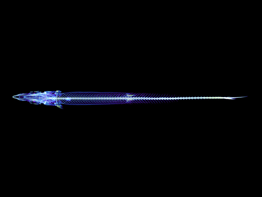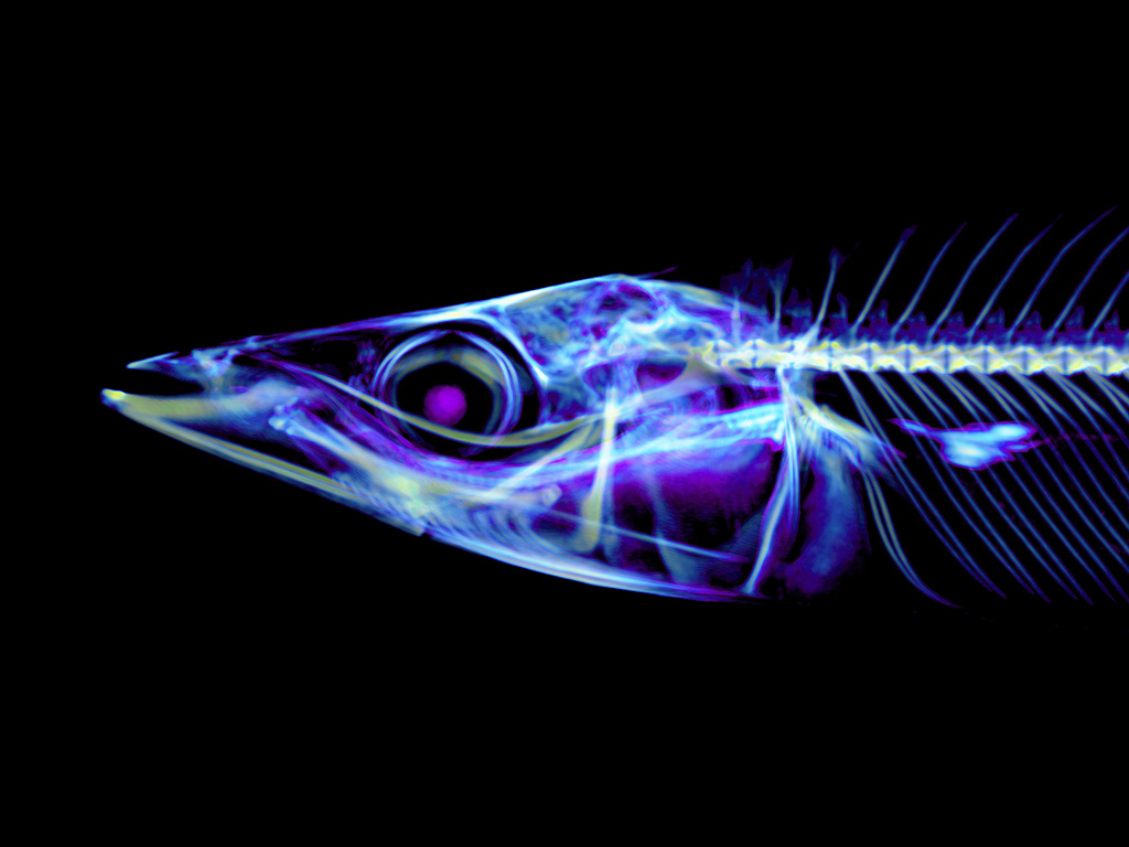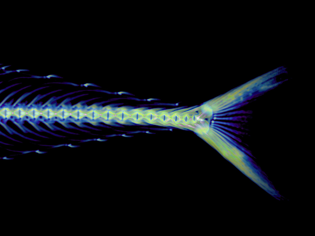 CT scans clearly reveal a row of thin, sharp small bones near the body's center. These bones support the body while also serving as defense against predators.A space for holding the swim bladder is visible in the abdomen, enabling buoyancy control during swimming. The tail tip features a V-shaped skeletal structure, developed to efficiently capture water and generate propulsion.